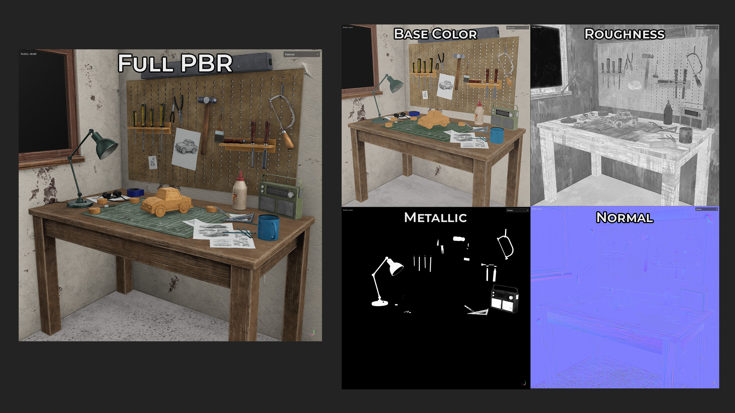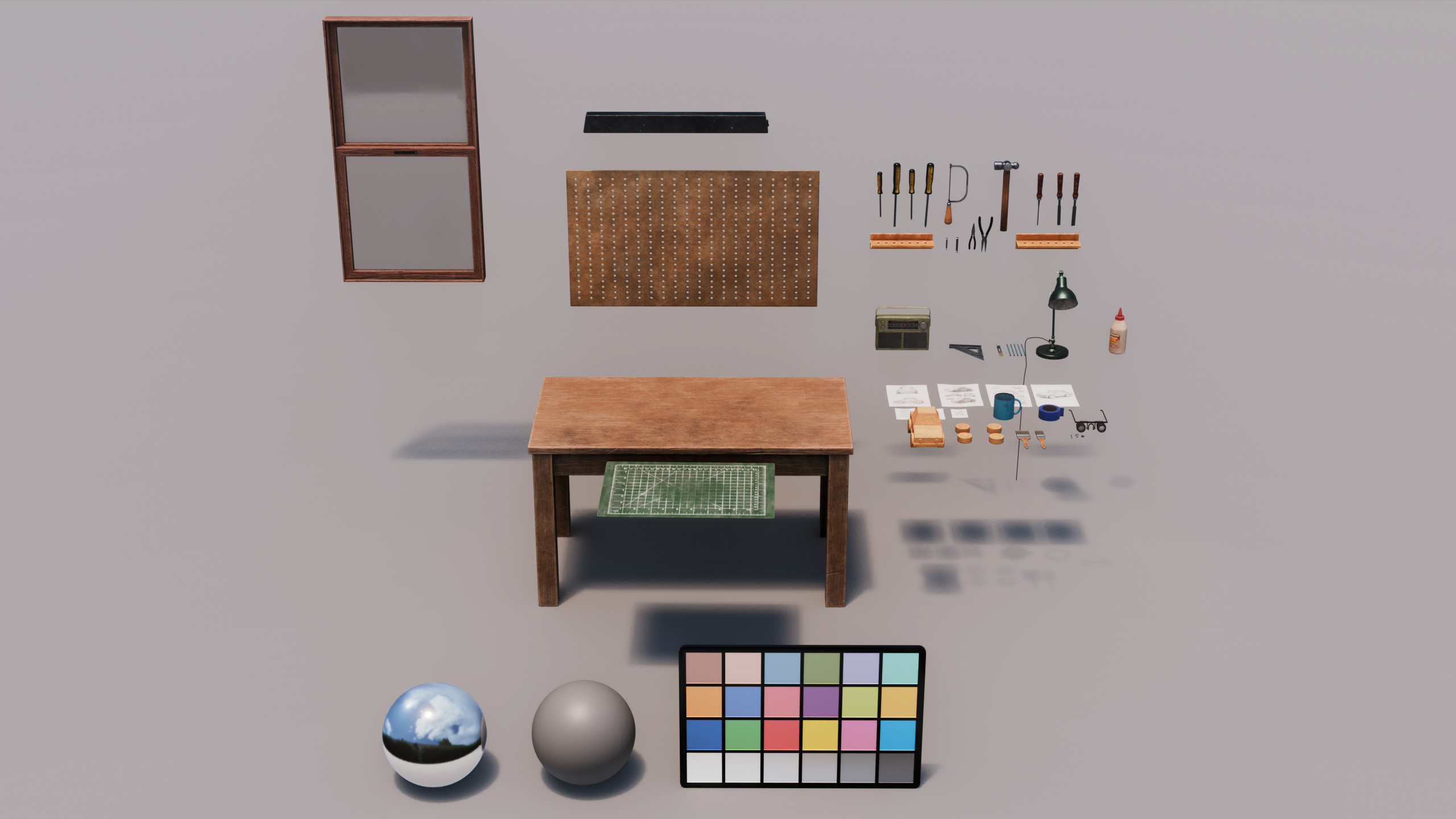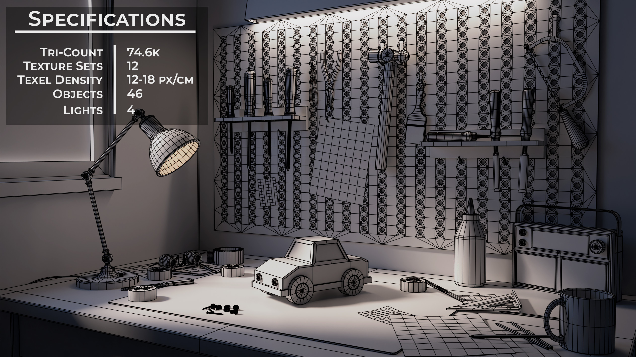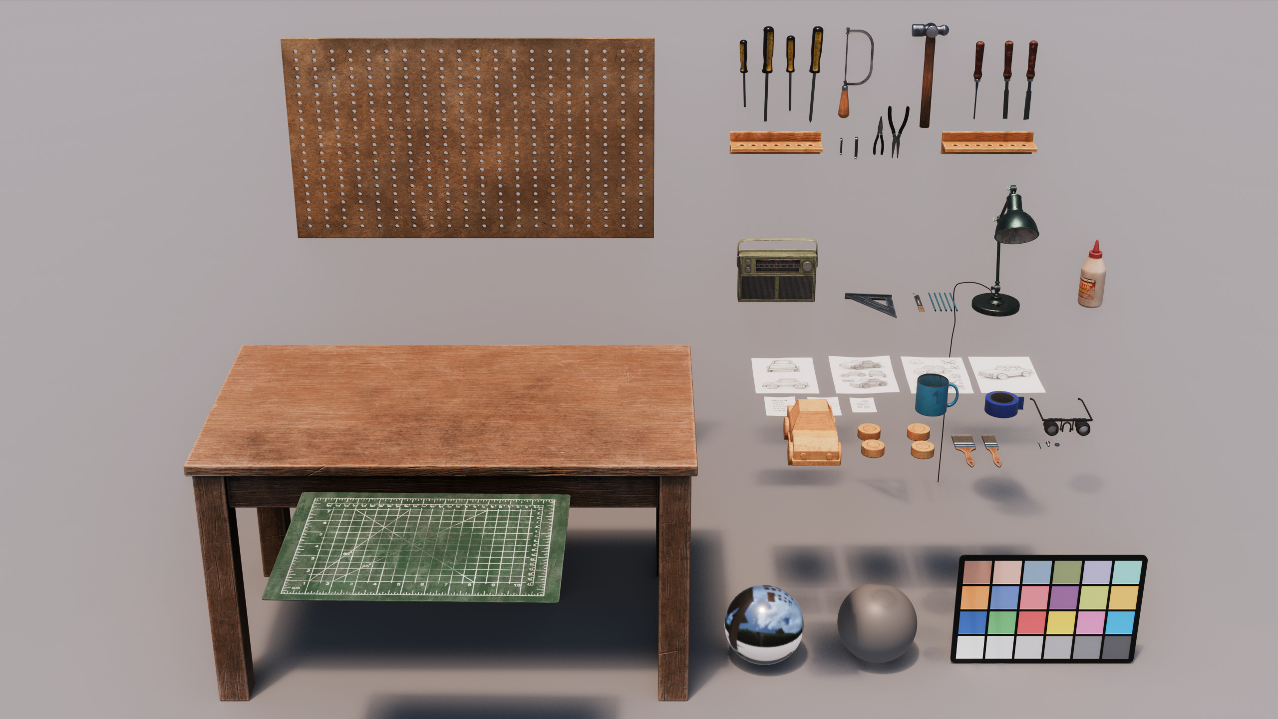 A game-ready woodworking workbench environment focused on material storytelling and real-time efficiency.